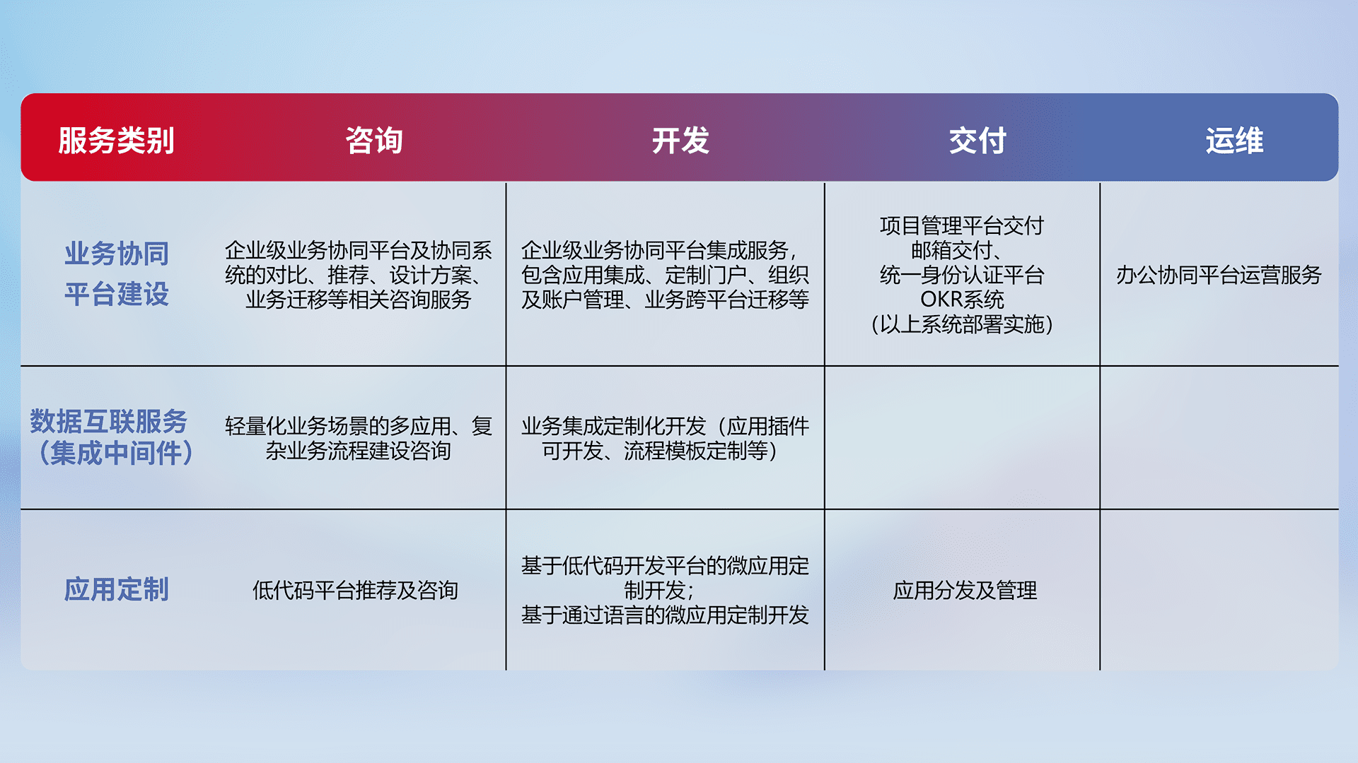 针对钉钉、、企微、、、、IDaas等平台级产品提供产品的规划、、、、方案、、、交付、、定制化开发等服务,,实现如统一协同办公、、、、智能客户服务、、、混合会议管理、、、智能数据查询、、、、等业务场景,,实现数字化转型。。