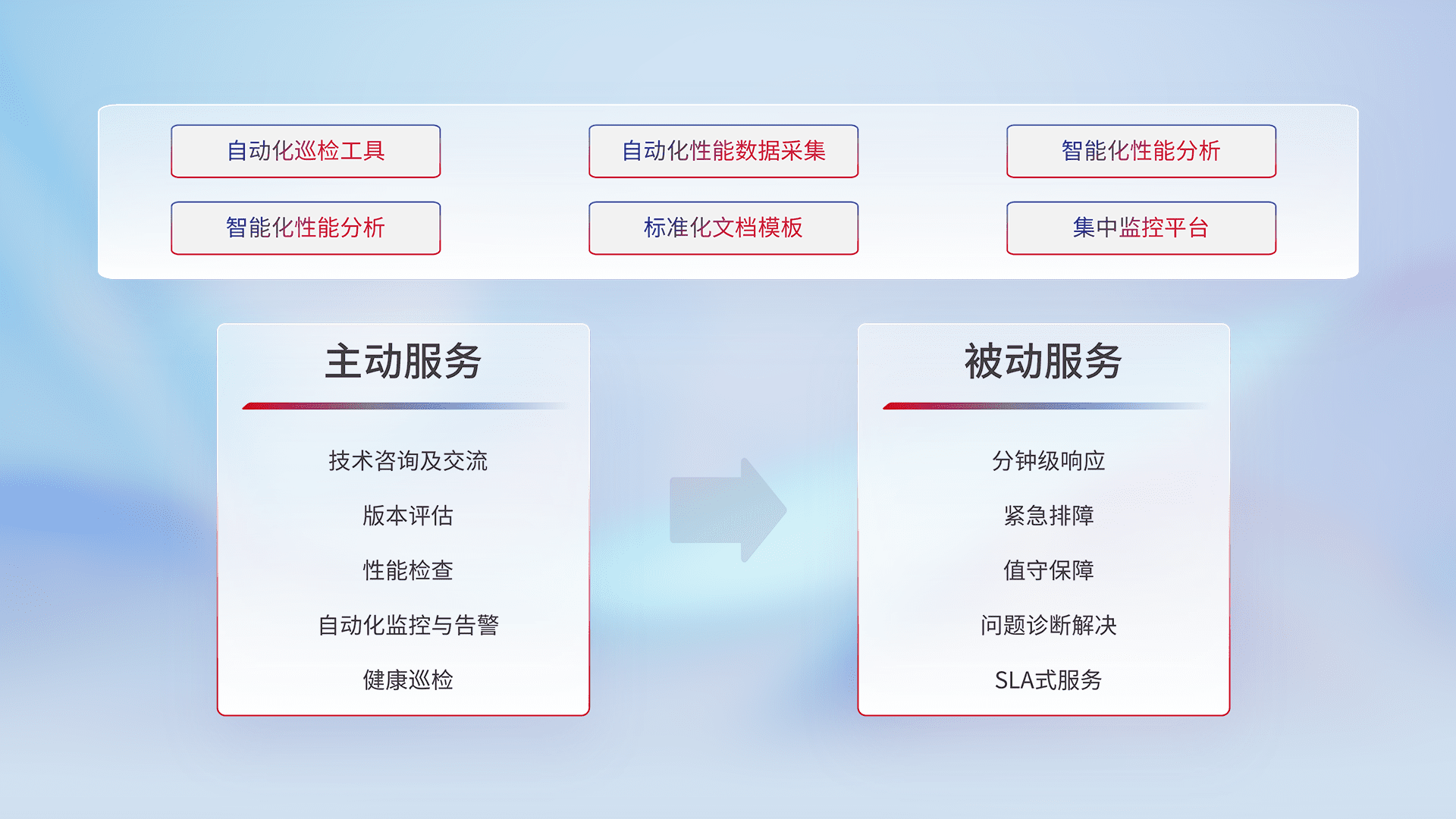 智能化工具和标准化文档,,,保障服务质量,,,,提供主动服务(包含技术咨询、、、、版本评估、、、性能检查、、自动化监控与告警、、、、健康巡检)和被动服务包含(分钟级响应、、紧急排障、、值守保障、、、、问题诊断解决、、、、SLA服务)。。