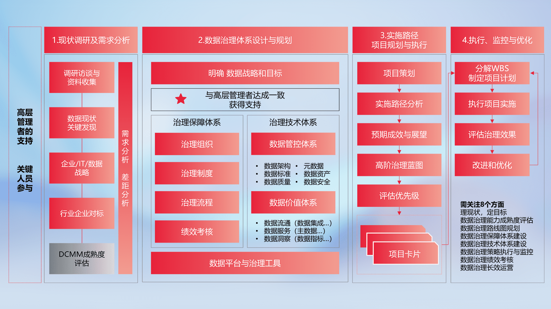 制定并执行统一的数据标准,,,规范数据定义和格式,,,,消除冗余和不一致性,,,实现跨部门和跨系统的数据一致性,,为企业提供标准化的数据基础。。